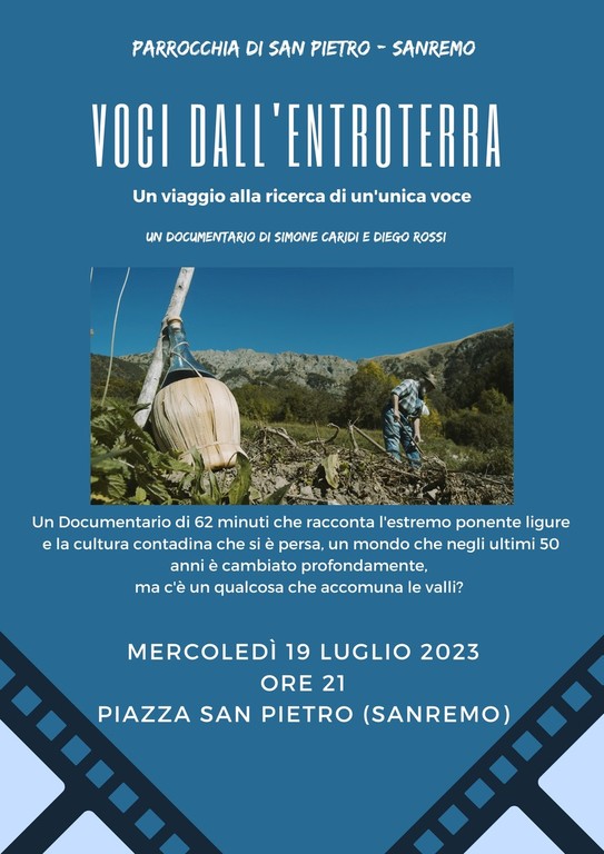 Mercoledì 19 luglio ore 21.00 presso la parrocchia di San Pietro verrà proiettato il documentario Voci dall’Entroterra del filmaker Sanremese Simone Caridi coadiuvato dalla guida ambientale Diego Rossi, da molti conosciuto come Jack in the Green.