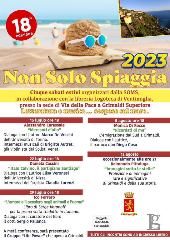 ‘Letteratura e musica… sospese sul mare’: cinque sabati estivi per la 18ª edizione di ‘Non Solo Spiaggia 2023’ organizzati dalla SOMS, in collaborazione con la libreria Logoteca di Ventimiglia, presso la sede di Via della Pace a Grimaldi Superiore