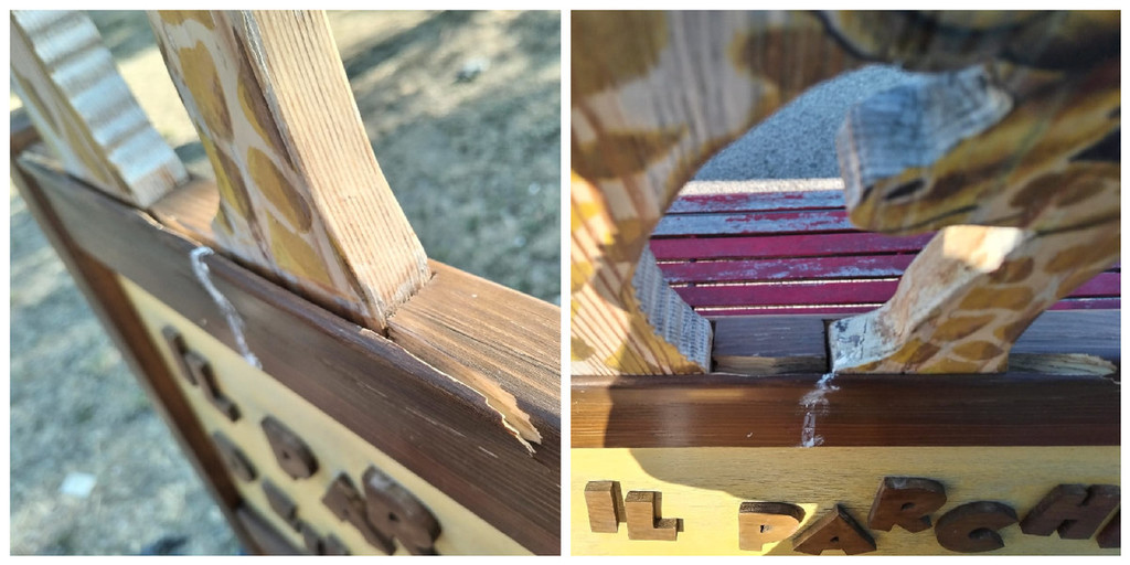 Ancora una volta il Parchetto della Giraffa è stato danneggiato. A farne le spese il cartellone all'entrata, la cornice spezzata e le "giraffette" staccate....