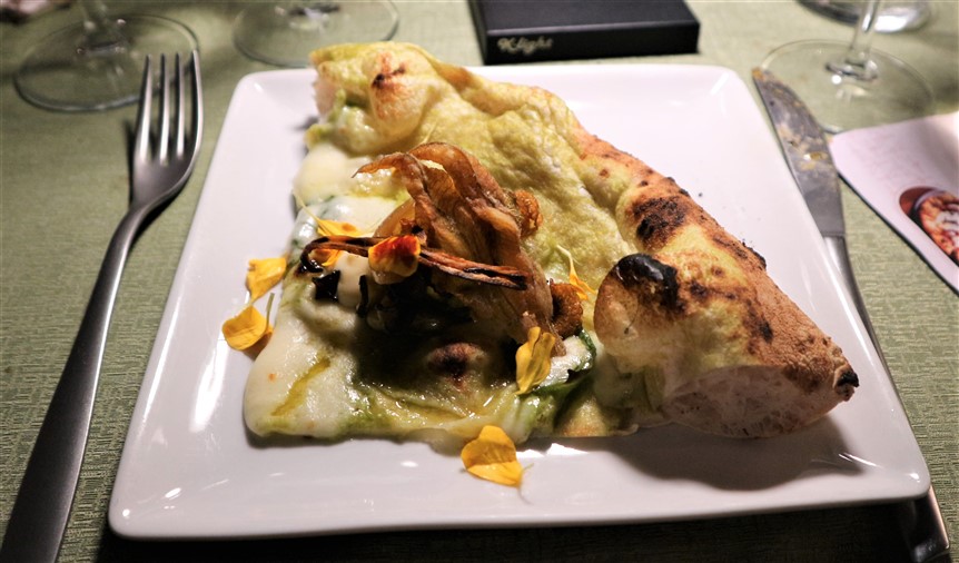 CERIANA DOP Fior di latte, crema di zucchine trombette del mio orto e le sue chips, salsiccia di Ceriana DOP, aria di timo, mosaico di peperoncino
