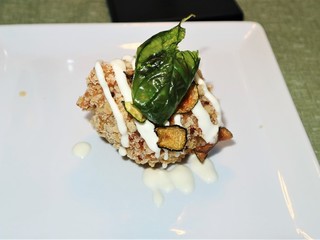 ASTICE E ASSOLUTO DI MELANZANE Fior di latte, astice al vapore, melanzana marinata alla soia, pomodoro Solania semi dry, purè di melanzana, latte cotto affumicato, coulis di basilico, chips di melanzane.