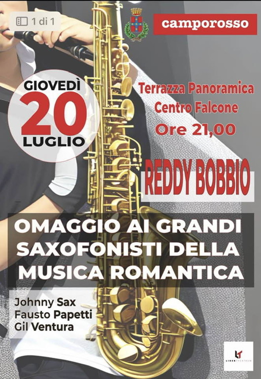 “Questa sera non perdetevi lo spettacolo del maestro Reddy Bobbio che renderà omaggio ai grandi sassofonisti della musica romantica" - annuncia il sindaco di Camporosso Davide Gibelli - “Vi aspettiamo alle 21 presso la terrazza panoramica del centro Falcone di Bigauda”.