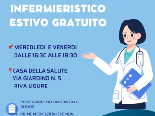 Anche quest’anno a Riva Ligure è attivo l’ambulatorio infermieristico estivo gratuito. Fino al 30 agosto residenti e turisti potranno contare sulla professionalità di due infermiere presenti il mercoledì e il venerdì dalle 16.30 alle 18.30 nei locali della Casa della Salute in via Giardino 5.