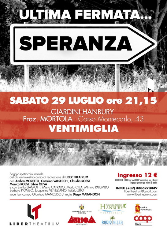 Sarà sabato 29 luglio alle ore 21.15 lo spettacolo teatrale ‘Ultima Fermata… Speranza’ - saggio del diciannovesimo corso di recitazione di Liber Theatrum diretto da Diego Marangon - ad aprire la nona edizione di ‘HanburycheSpettacolo!’23 – teatro in movimento e concerti d’estate, festival di arti varie ospitato nella splendida ambientazione dei Giardini Botanici Hanbury a Ventimiglia in frazione La Mortola Inferiore.