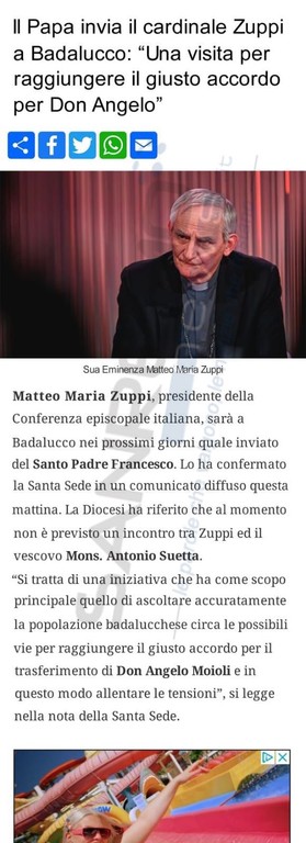 Il titolo recita “Il Papa invia il cardinale Zuppi a Badalucco: “Una visita per raggiungere il giusto accordo per Don Angelo”” con una grafica identica a quella utilizzata dal nostro giornale.