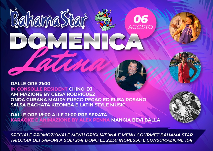 Il mese di agosto si prospetta come un periodo di grandi eventi latini al ‘Bahama Star’ di Valle Armea. Il locale, che ormai da più di 8 anni è protagonista del panorama latino, ha deciso di alzare il tiro proponendo nelle consuete domeniche latine, una ricca animazione chiamando i migliori animatori del momento, facendoli esibire insieme, confrontando i propri stili per arricchire ulteriormente il pubblico che vorrà esibirsi insieme a loro.