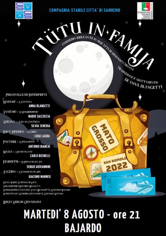 Martedì 8 agosto torna a Bajardo la Compagnia Stabile Città di Sanremo con la commedia dialettale 'Tütu in famija'. Due atti di Ermanno Carsana, traduzione ed adattamento di Anna Blangetti, supervisione di Aldo Bottini, regia di Sergio Giovannini.