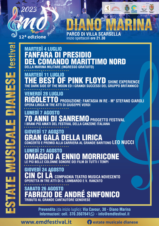 Dopo la serata dedicata al Festival di Sanremo, l’Emd Festival osserverà una decina di giorni di pausa per poi proporre gli ultimi quattro spettacoli in poco più di una settimana, dal 17 al 26 agosto: dal gala della Lirica (con la presenza del grande baritono Leo Nucci) all’omaggio a Morricone, da uno dei capolavori dell’operetta (Cin Ci Là) al tributo a Fabrizio De Andrè.
