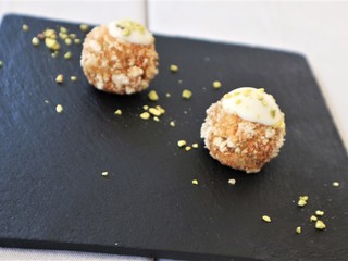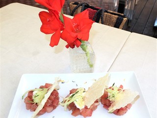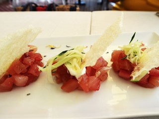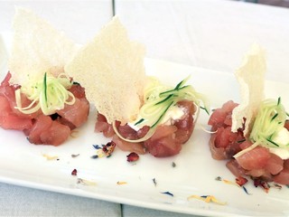 Per iniziare viene servito un amuse-bouche: una polpettina di patate e cozze, impanata nel panko, con un ciuffo di maionese che ci accompagna verso un antipasto importante come la Tartare di tonno con una julienne di cetrioli dell’orto e stracciatella e nuvole di riso.