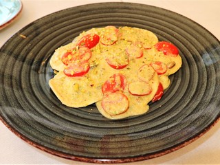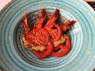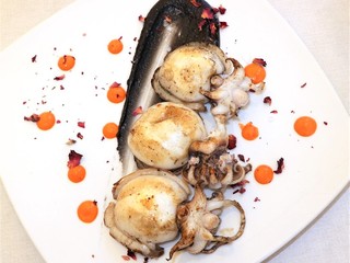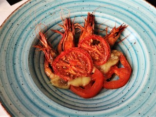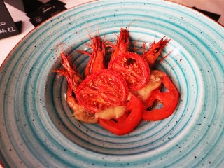 Nel menù sono presenti fra gli antipasti anche i Gamberi di Sanremo con porri, pomodori abbrustoliti e capperi, il tuorlo croccante con cavolo viola e crumble di olive e un carpaccio di manzo con caviale di moscato, lamponi e crema di mozzarella. I primi sono la grande passione dello chef.
