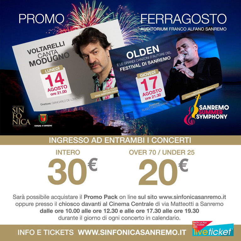 Per ringraziare il pubblico e festeggiare insieme prima e dopo Ferragosto, la Fondazione ha lanciato una PROMO che permette di acquistare a prezzo scontati i biglietti per le due imperdibili produzioni dell’Orchestra Sinfonica di Sanremo: