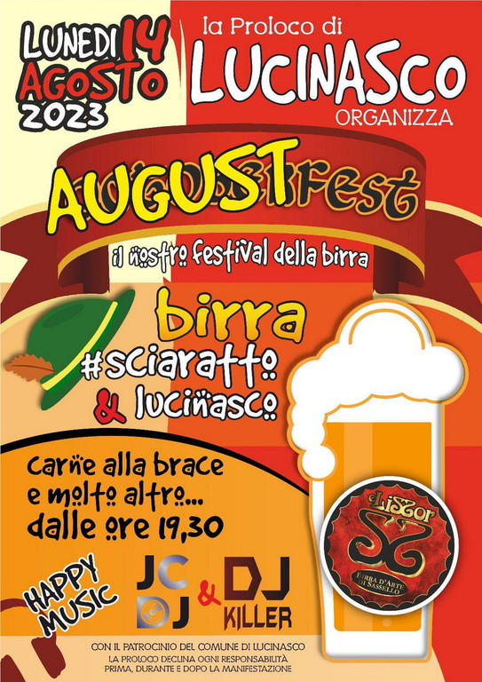 Lunedì prossimo, 14 agosto, la Proloco di Lucinasco, a partire dalle 19.30, organizza la Festa della Birra. Spiegano gli organizzatori: “Potremmo dire che è una delle feste più attese dell'estate qui nella valle Impero, o semplicemente che Lucinasco, tra le altre cose, è conosciuto anche per questa serata. O, ancora, che, se si va in giro a chiedere ‘cosa fai il 14 agosto?’ la risposta che viene in modo quasi naturale è ‘Lucinasco’. Inutile dirlo, stiamo parlando della Festa della birra, che quest'anno firma la sua quarta edizione".