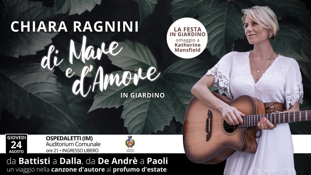 La cantautrice ligure Chiara Ragnini si esibirà, nella splendida cornice dell'Auditorium di Ospedaletti giovedì 24 agosto dalle 21, con lo spettacolo Di Mare e d'Amore accompagnata al piano elettrico da Andrea Leoncini: un viaggio fra le più belle canzoni d'autore dove il mare e l'amore si intrecciano in musica e parole alla scoperta delle composizioni al sapore di sale firmate dai grandi cantautori come Lucio Dalla, Lucio Battisti, Fabrizio De Andrè, Gino Paoli e Fred Buscaglione fino ad arrivare a Giuni Russo, Loredana Bertè e molti altri artisti della scena musicale contemporanea, attingendo anche al vasto repertorio della cantautrice ligure, che all’attivo ha già due album e un ep di inediti.