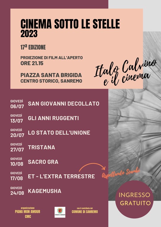 Anche per quest'ultima, e settima, proiezione del “Cinema sotto le stelle”, il pubblico potrà approfondire il legame tra Italo Calvino e il cinema nella relazione “Il cinema è stato tutto un mondo”, firmata da Letizia Lodi, storica dell’arte, attuale direttrice del Museo Nazionale di Ravenna. La rassegna è sostenuta dal contributo economico del comune di Sanremo – Assessorato al Turismo, Sport e Manifestazioni (di concerto con l'Assessorato alla Cultura) ed è inserita nel calendario delle manifestazioni estive 2023 della Città dei Fiori. L'ingresso per il pubblico è gratuito.
