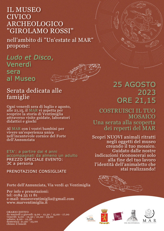 Il Museo Civico Archeologico “G. Rossi” di Ventimiglia propone “Ludo et Disco, venerdì sera al Museo”, una serata dedicata ai bambini e alle loro famiglie in cui il Mar apre le sue porte per vivere insieme un’esperienza unica dove storia, racconti e giochi si intrecceranno nell’incantevole atmosfera del Forte dell’Annunziata. Domani, venerdì 25 agosto, alle 21,15 vi sarà "Costruisci il tuo Mosaico", una serata alla scoperta dei reperti del Mar.
