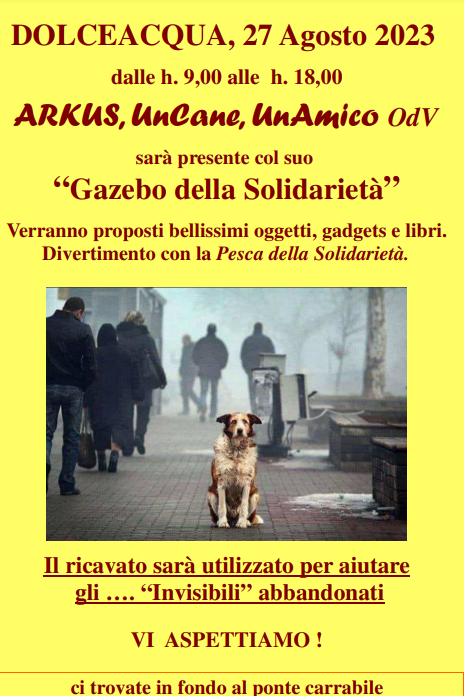ARKUS, UnCane, UnAmico OdV sarà presente a Dolceacqua il 27 agosto dalle 9 alle 18 con un gazebo della solidarietà.