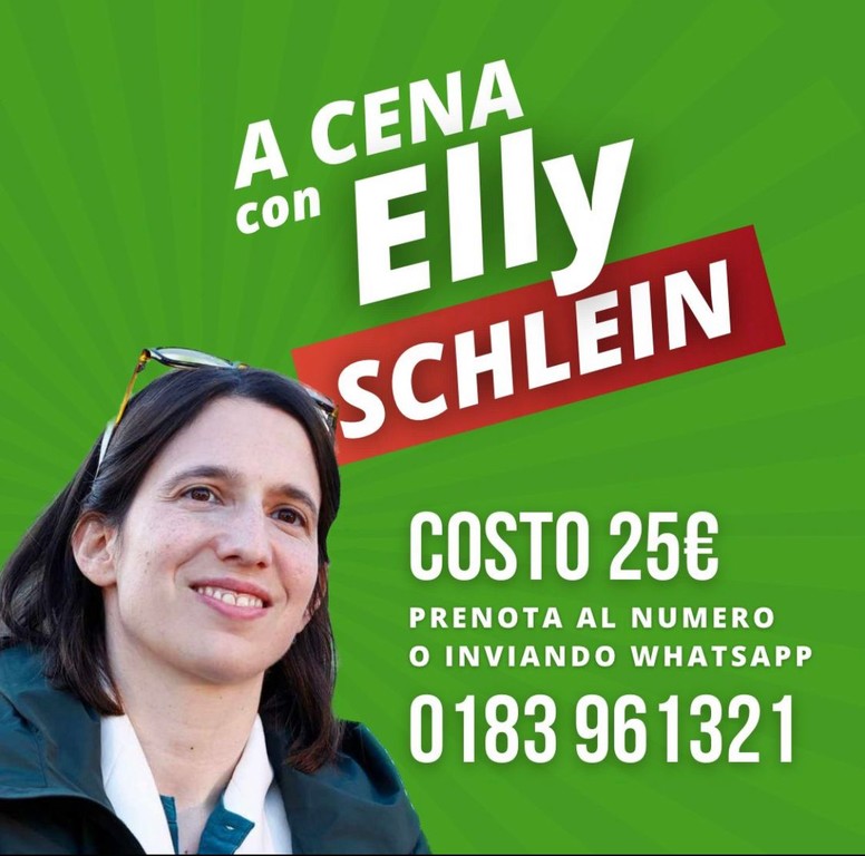 C'è grande attesa per l'arrivo di Elly Schlein. Chi vorrà potrà partecipare anche a una cena con lei al costo di 25 euro. Per prenotare contattare lo 0183 961321.
