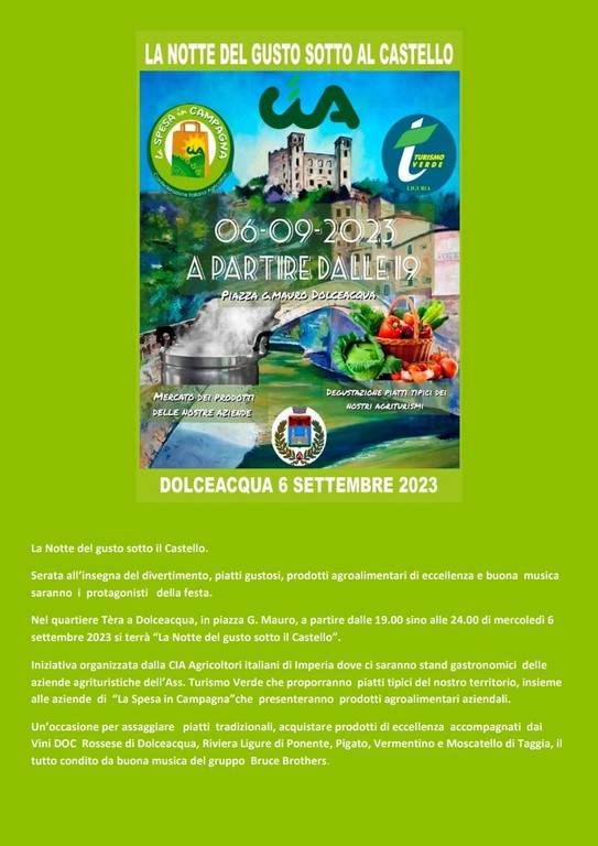 Nel quartiere a Tèra a Dolceacqua, in piazza G. Mauro, a partire dalle 19 sino alle 24 di mercoledì 6 settembre si terrà l'iniziativa organizzata dalla CIA Agricoltori italiani di Imperia dove ci saranno stand gastronomici delle aziende agrituristiche dell’assessore Turismo Verde che proporranno piatti tipici del nostro territorio, insieme alle aziende di La Spesa in Campagna che presenteranno prodotti agro alimentari aziendali.
