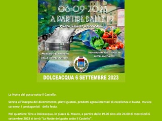 A Dolceacqua andrà in scena la Notte del gusto sotto il castello. Serata all’insegna del divertimento, piatti gustosi, prodotti agro alimentari di eccellenza e buona musica saranno i protagonisti della festa.