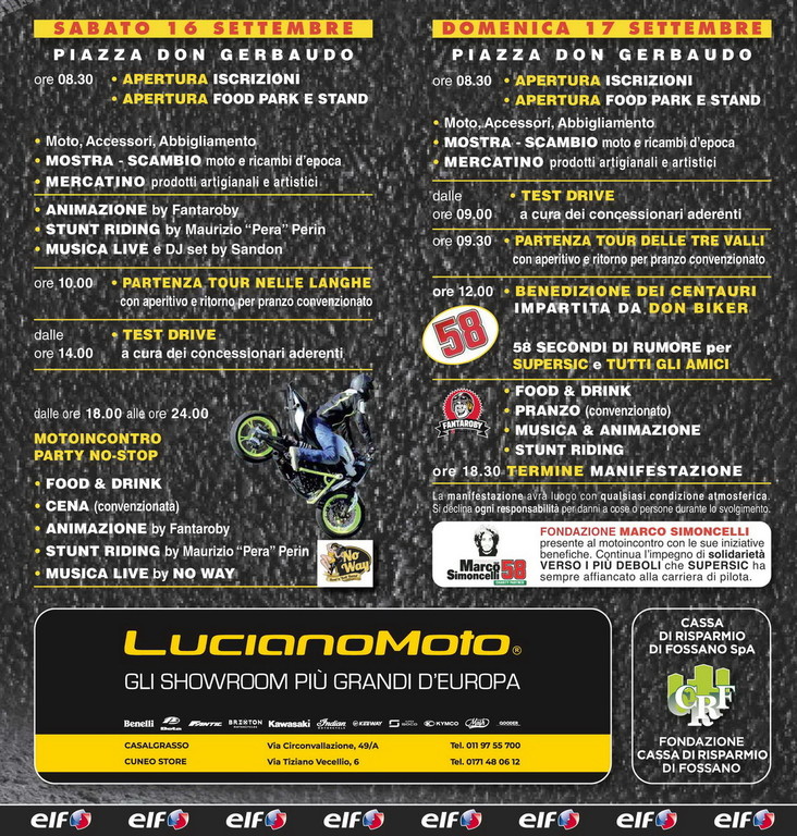 Sabato 16 settembre alle 8,30 è prevista l’apertura delle iscrizioni, degli stand e del Food Park. Alle 10 il primo appuntamento in programma è un tour nelle langhe in moto con aperitivo lungo il percorso e rientro per il pranzo convenzionato al Food Park, l’area ristorazione ufficiale allestita dal Pala CRF in Piazza Don Gerbaudo. In collaborazione con Caffè Italiano e il birrificio Trunasse, il Food Park apre da sabato mattina fino a domenica sera: street food, menù completi, birra artigianale e tanta musica.