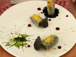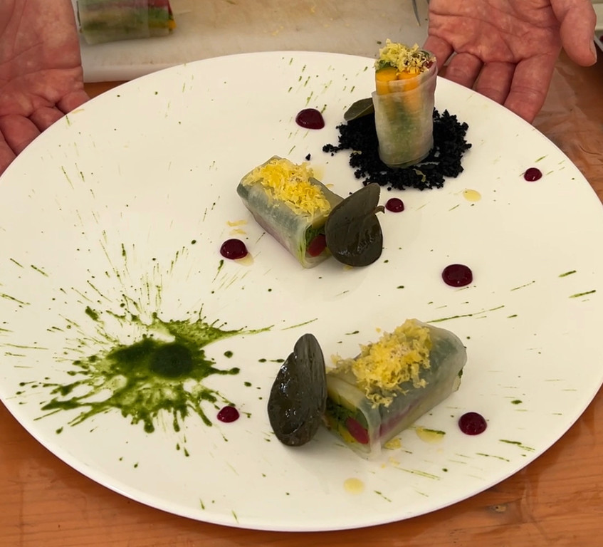 Composizione piatto: prendere 3 fette di daikon, stenderlo su un tagliere e adagiare delicatamente 2 pezzi per tipologia di verdura aggiungendo anche il bagnetto. Dopodiché ruotare su se stesso il daikon per ottenere gli involtini. In un piatto piano largo mettere un mucchietto di polvere di pane nero, posizionare sopra un involtino e gli altri due vicini, decorare con il gel di barbabietola eun po’ di tuorlo marinato grattato sopra ogni involtino.
