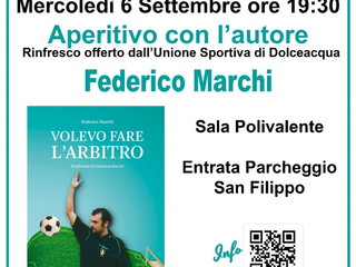 Proseguono le presentazioni del libro 'Volevo fare l'arbitro' (ed. De Ferrari ) di Federico Marchi. Dopo la serata ad Arma di Taggia, il nuovo appuntamento è per domani (mercoledì 6 settembre) a Dolceacqua nell'ambito degli eventi 'Aperitivo con l'autore'. La prestazione è in programma alle ore 19:30 alla Sala Polivalente, per parlare di sport e degli arbitri di calcio.
