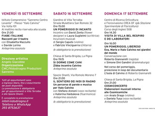 A partire dalle 15.00 David Zonta e Laura Guglielmi sono i protagonisti di Un pomeriggio di incanto. In programma una visita guidata al bellissimo parco (organizzata in più turni) a cura del flower designer David Zonta e un incontro con la giornalista e scrittrice Laura Guglielmi, profonda conoscitrice del rapporto fra Calvino e il suo paesaggio d’origine.