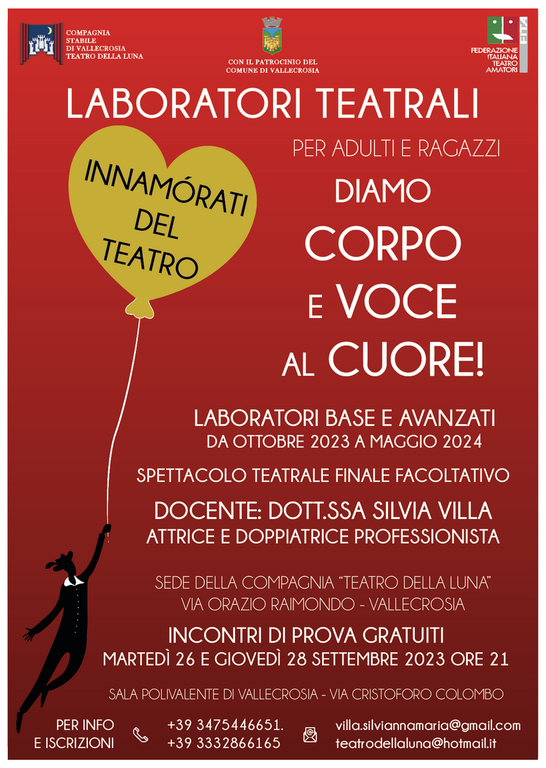 Tornano anche quest’anno, dopo il successo e la numerosa partecipazione dello scorso anno, i laboratori teatrali condotti dalla dottoressa Silvia Villa, in collaborazione con La Compagnia Stabile di Vallecrosia 'Teatro della Luna', attiva da quasi 20 anni sul territorio con importanti lavori teatrali e con il gradito patrocinio del comune di Vallecrosia.