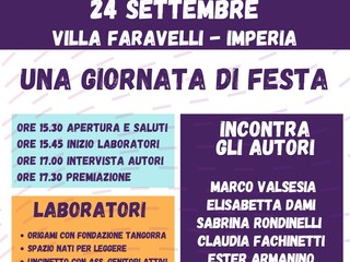 La giornata si aprirà alle 15.30 e un ricco programma intratterrà i giovani lettori e i ragazzi con diversi laboratori: Crea il tuo origami con la Fondazione Tangorra di Novara; Crea l'uncinetto con Aga Associazione dei Genitori Attivi di Imperia; La vita segreta delle api a cura di Marco Valsesia e il laboratorio-tech In viaggio nelle storie a cura di Eureka cooperativa sociale Imperia.