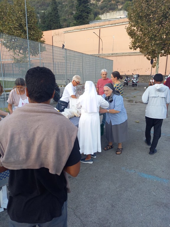 Un servizio solidale preso in carico, lo scorso 25 ottobre, da don Rito, parroco della parrocchia di San Rocco a Vallecrosia, che è riuscito a coinvolgere associazioni, volontari della parrocchia e del comitato festeggiamenti di San Rocco che ogni settimana distribuiscono il cibo alle persone che si mettono ordinatamente in fila e aspettano il loro turno per mangiare e bere, per terra, davanti al cimitero di Ventimiglia. “A pranzo mangiano alla Caritas ma, visto che alla sera è chiusa, noi portiamo la cena ai migranti" - racconta don Rito, parroco della parrocchia di San Rocco a Vallecrosia - “Offriamo un pasto caldo alle persone che sono di passaggio o che si sono accampate in città. Diamo da mangiare a circa 200-330 persone. Nel mese di settembre la parrocchia di San Rocco ha distribuito più di mille pasti. La nostra comunità sta rispondendo bene, in tanti dedicano il loro tempo per aiutare queste persone che desiderano passare il confine”.