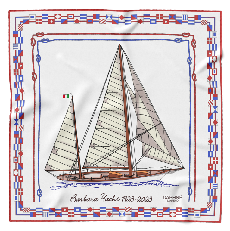 Per festeggiare i cento anni di navigazione di Barbara, la Maison ligure ha immortalato le linee di questa longeva vela su twill di seta sostenibile, per un foulard esemplare unico e celebrativo. Una vela che da subito ha catalizzato l'attenzione di tutti perchè, quest'anno, come la città di Imperia, ha compiuto un secolo.