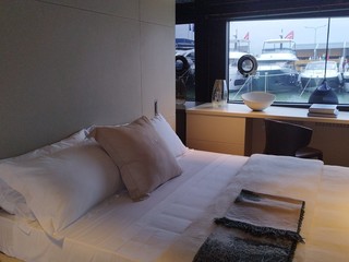 'F-100 Glass Cabin' è lo yacht realizzato dallo studio degli architetti e designer Roberto Palomba e Ludovica Serafini. “E' una barca molto particolare, quasi da sera con toni scuri”, continua Barbara Amerio, che per i dettagli tecnici lascia a Roberto Palomba.