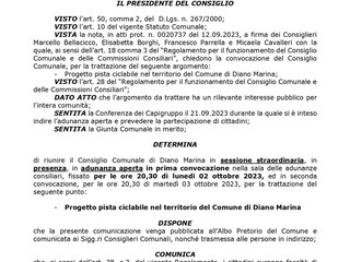 A seguito della richiesta dei gruppi di opposizione, discussa in sede di Conferenza dei Capogruppo che si è tenuta lunedì scorso e di apposito parere espresso in data odierna dalla Giunta Comunale, il Presidente del Consiglio Comunale di Diano Marina ha convocato per il prossimo 2 ottobre alle ore 20:30 un Consiglio Comunale monotematico in adunanza aperta avente come oggetto "Progetto pista ciclabile nel territorio del Comune di Diano Marina".