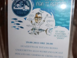 Un menù realizzato con passione dallo chef, Giacomo Di Martino, alias Jimmi, che conosce bene il pesce locale e che ha offerto ai clienti un'esperienza unica. “Il pesce che non ti aspetti” è il tema della serata, che ha avuto come protagonisti pesci poco considerati e apprezzati come il Totano rosso, lo Scorfano e la Lampuga.