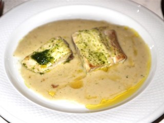 • Secondo piatto: Lampuga su crema di ceci. Un pesce dalla carne saporita e compatta, con sapore gradevole e presentato in perfetto equilibrio con la crema di legumi.