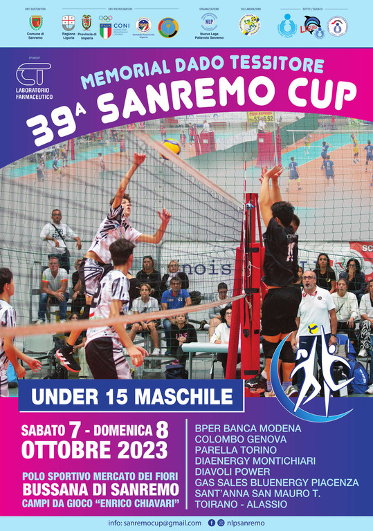 La 39a Sanremo Cup, dal 1993 abbinata al Memorial Dado Tessitore, è organizzata dalla Nuova Lega Pallavolo sotto l’egida della Federazione Italiana Pallavolo ed è inserita nel calendario manifestazioni 2023 del Comune di Sanremo, è sostenuta dal Laboratorio CT (sponsor) ed è patrocinata da Regione Liguria, Coni Liguria, Provincia di Imperia, Csen Imperia e Panathlon Club Imperia-Sanremo.
