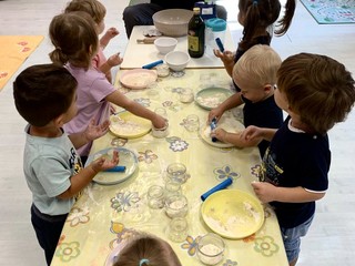 Il secondo giorno: “in cucina” con i nonni Teresa, Furio e Rita, grazie ai quali i bambini si sono potuti “sporcare le mani” con gli ingredienti della focaccia, manipolandoli fino a formare un composto omogeneo e, una volta fatto lievitare e cotto, aver potuto apprezzare la loro “creazione”.