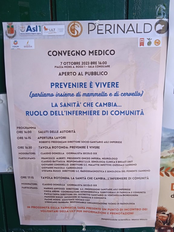 "Prevenire è vivere (parliamo insieme di mammella e di cervello)" e "La sanità che cambia... ruolo dell'infermiere di comunità" sono stati i temi al centro del convegno medico ospitato, oggi pomeriggio, nella sala consiliare di Perinaldo per sensibilizzare la popolazione sulla prevenzione di diverse malattie.