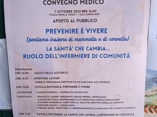 "Prevenire è vivere (parliamo insieme di mammella e di cervello)" e "La sanità che cambia... ruolo dell'infermiere di comunità" sono stati i temi al centro del convegno medico ospitato, oggi pomeriggio, nella sala consiliare di Perinaldo per sensibilizzare la popolazione sulla prevenzione di diverse malattie.