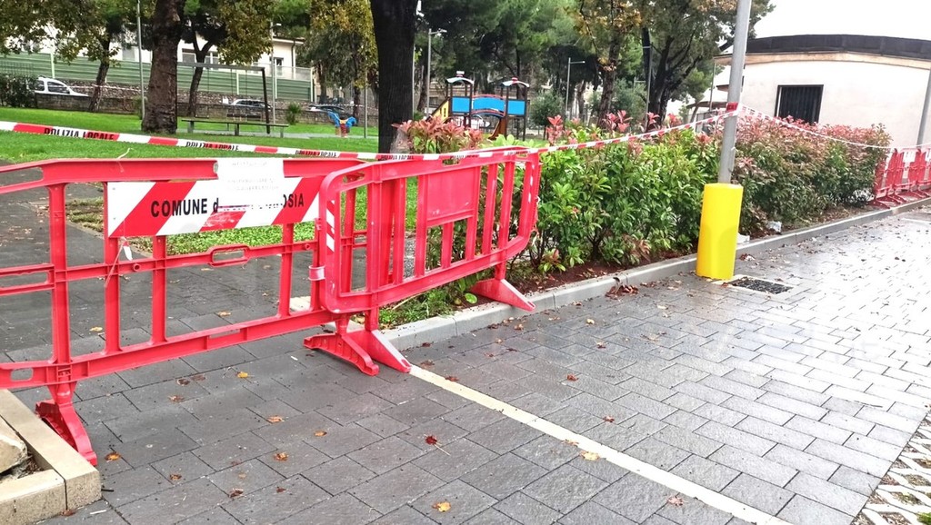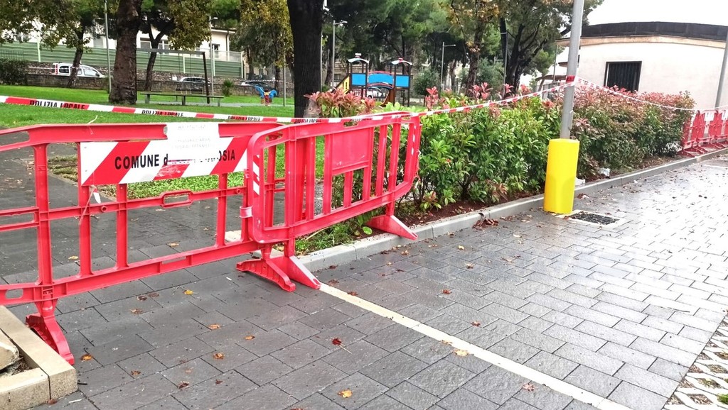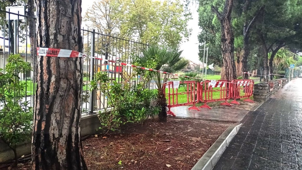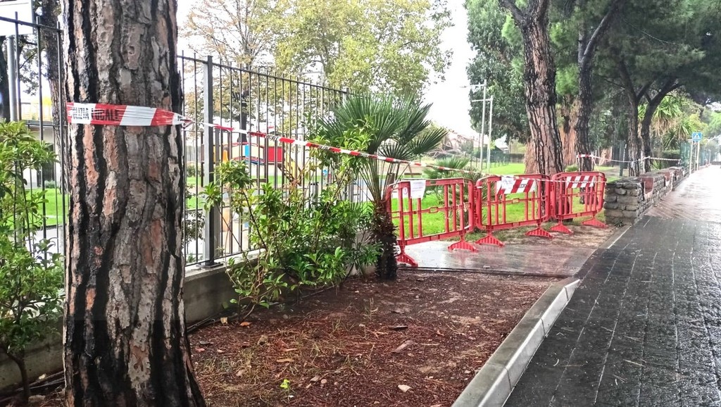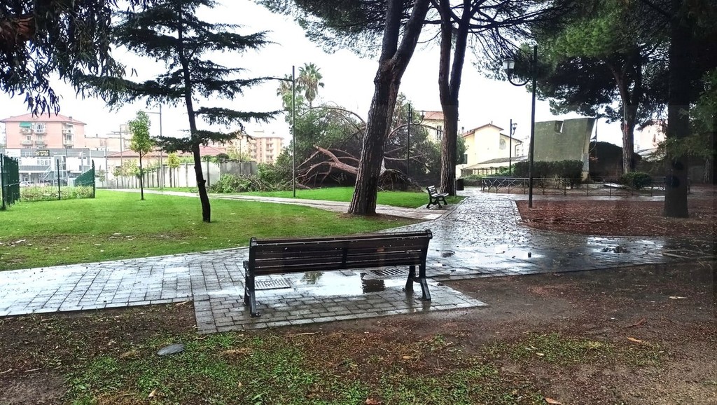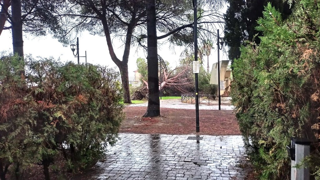 Un grosso pino è crollato, questa mattina, all’interno dei giardini di San Rocco a Vallecrosia.