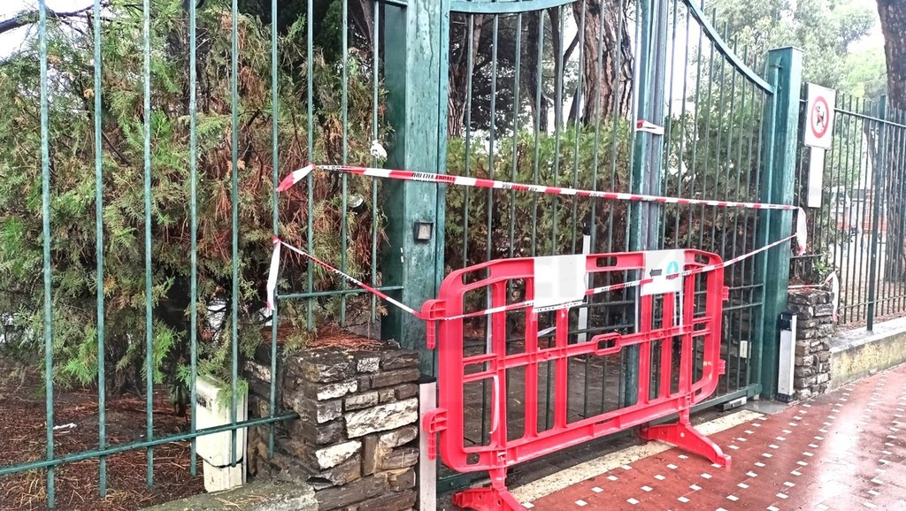 Vallecrosia: grosso pino cade ai giardini di San Rocco e finisce su un'area privata (Foto e Video)