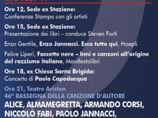 EVENTI DURANTE TUTTO IL GIORNO – Tra gli appuntamenti pomeridiani all’ex chiesa Santa Brigida, in collaborazione con Pigna Mon Amour, ci saranno i concerti di Paolo Capodacqua, (giovedì 19) di Armando Corsi (venerdì 20) e di Patrizia Cirulli con lo spettacolo in “Fantasia – Le poesie di Eduardo De Filippo” (sabato 21) mentre nella sede del Club, spazio alle presentazioni dei libri dei giornalisti Enzo Gentile (“Enzo Jannacci. Ecco tutto qui” – Hoepli), Felice Liperi (“Faccette nere – Inni e canzoni all’origine del razzismo italiano” – Manifestolibri) giovedì 19 e Michele Neri (“Cantautori e cantautrici del nuovo millennio. Dizionario” – Iacobelli Editore) sabato 21.