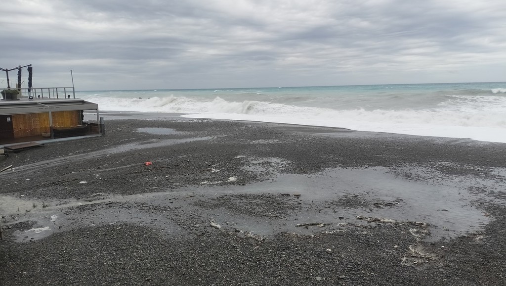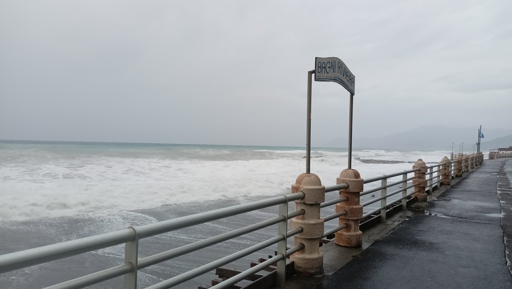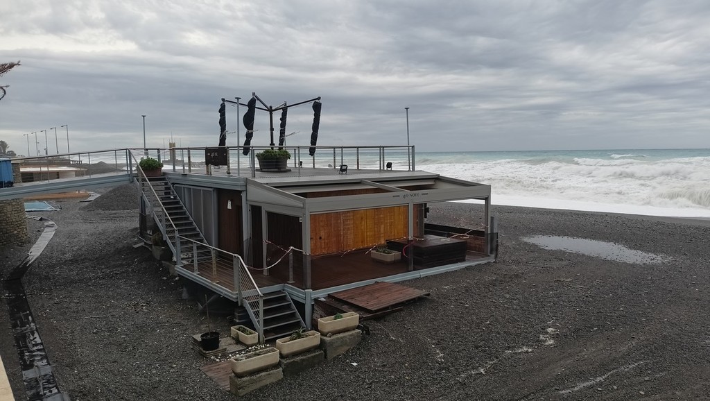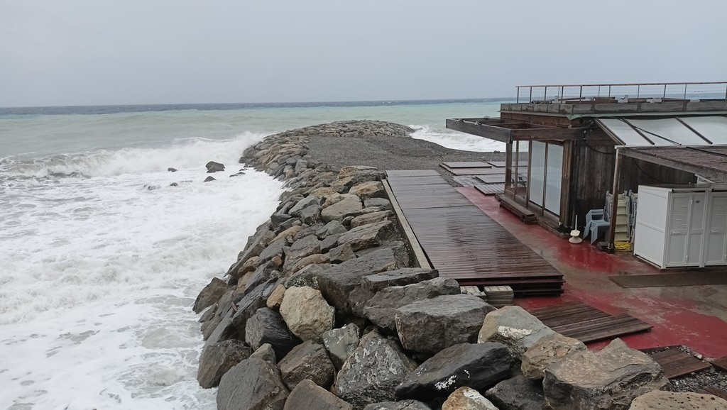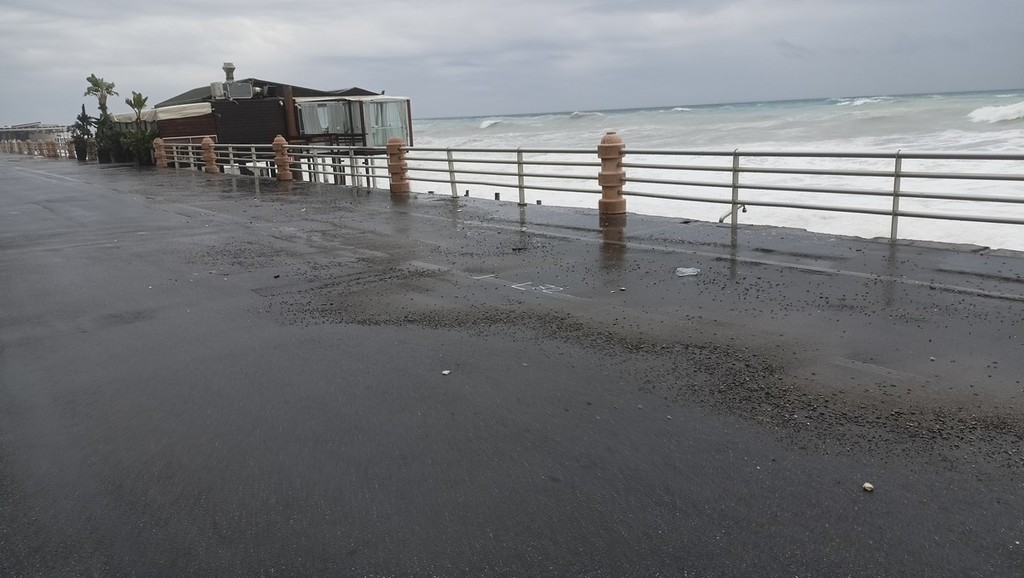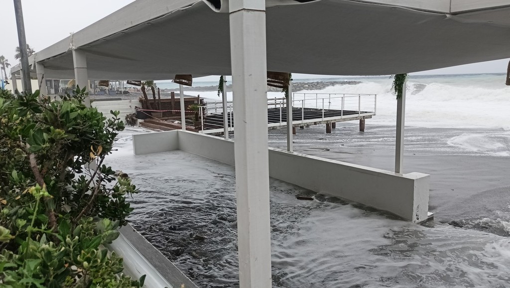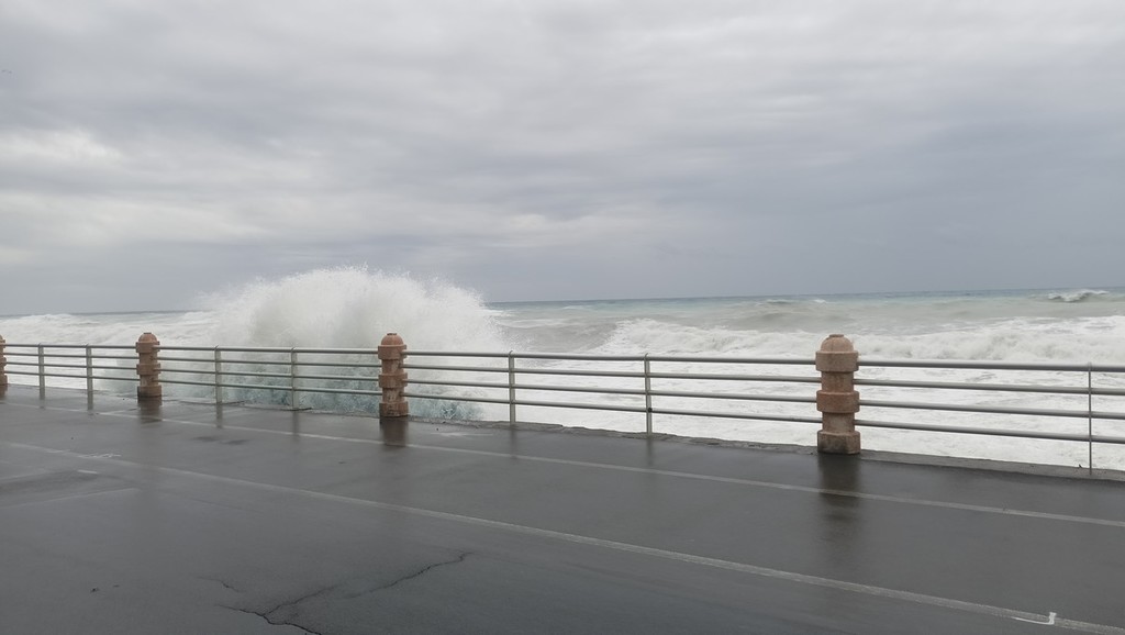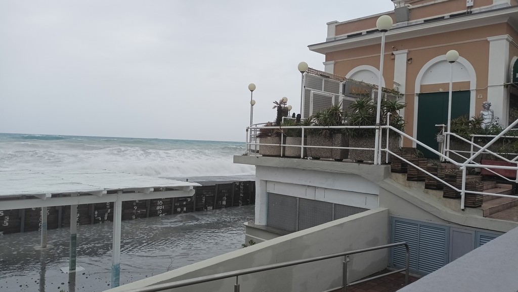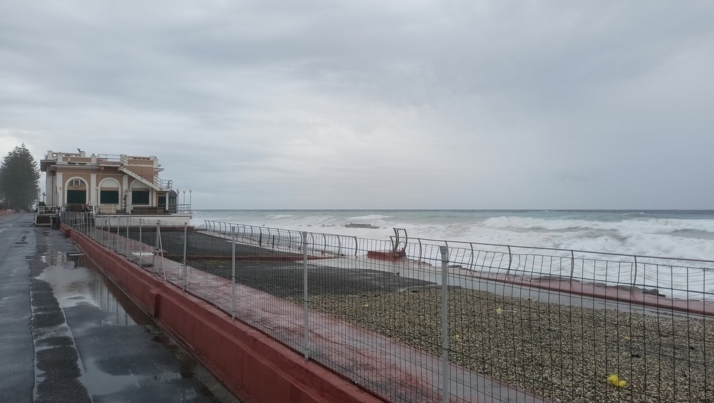 Mareggiata a Bordighera, le onde raggiungono la passeggiata e gli stabilimenti balneari (Foto e video)