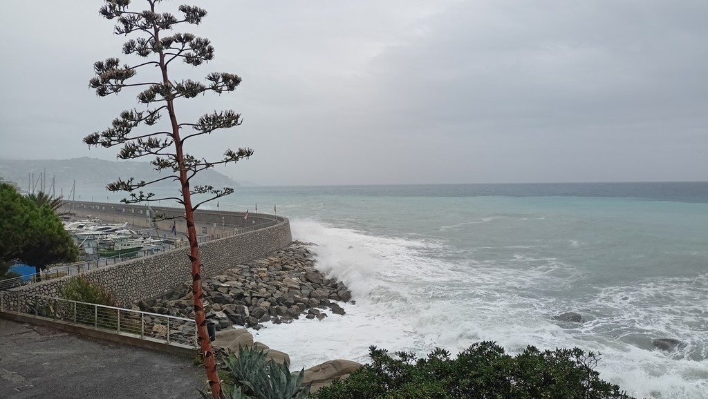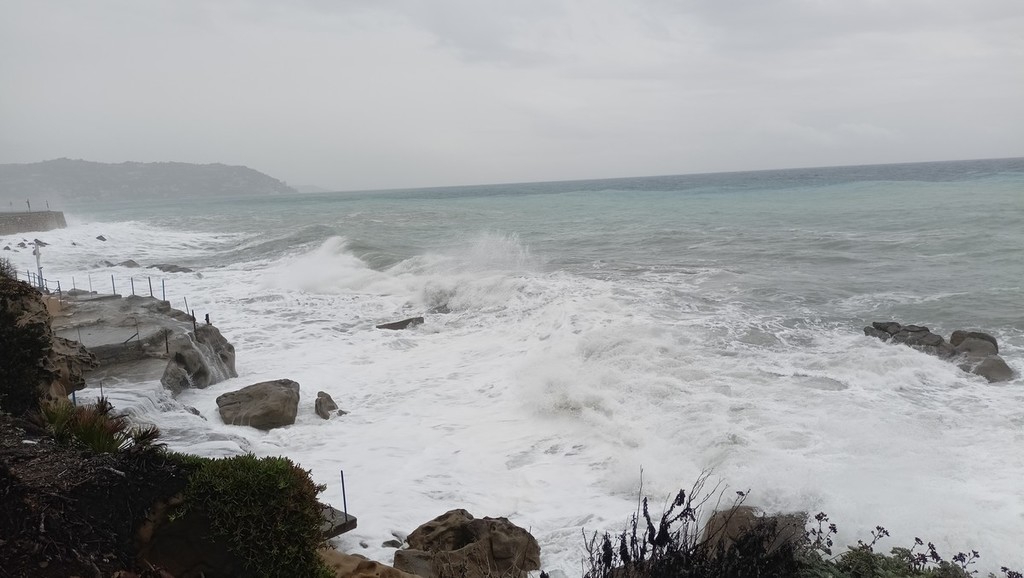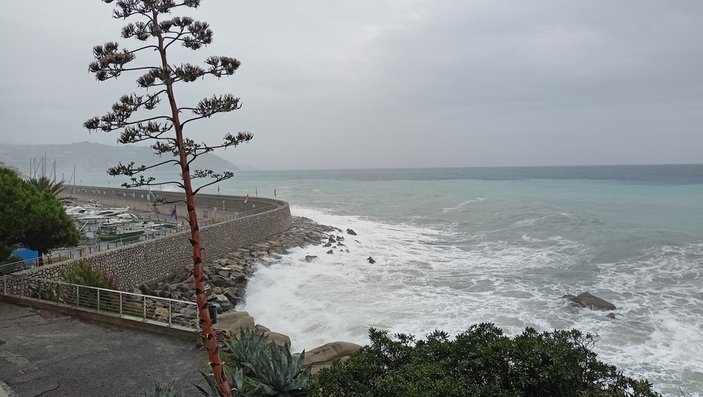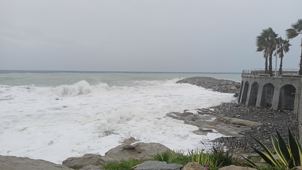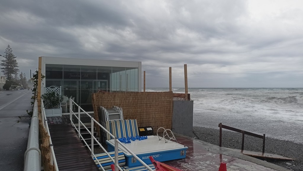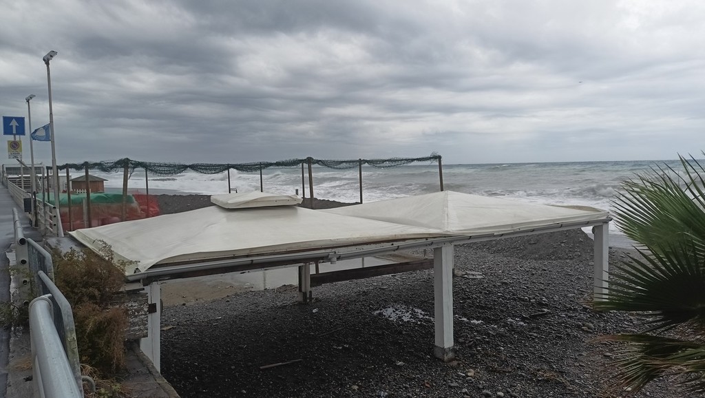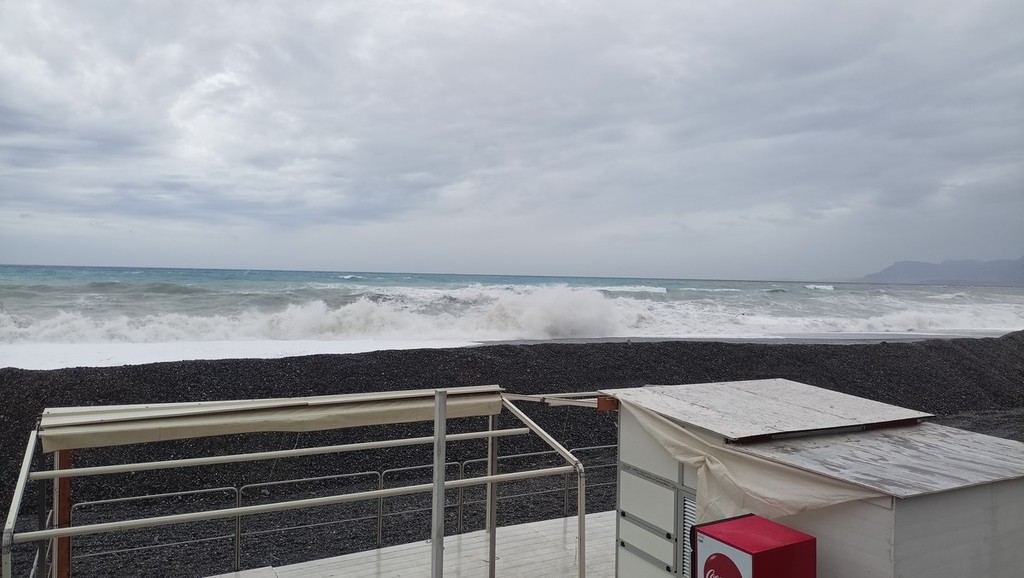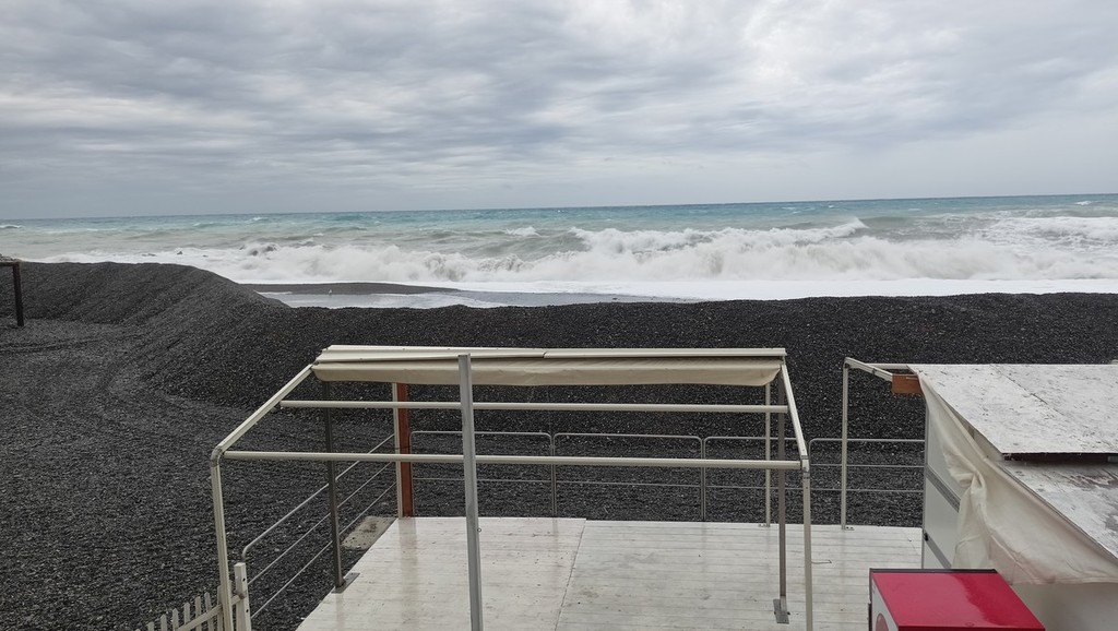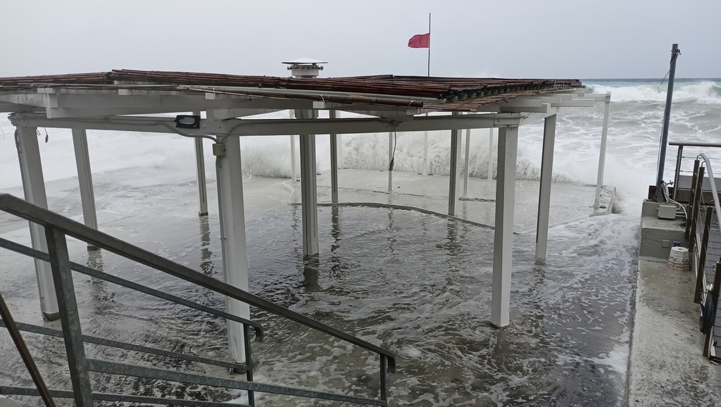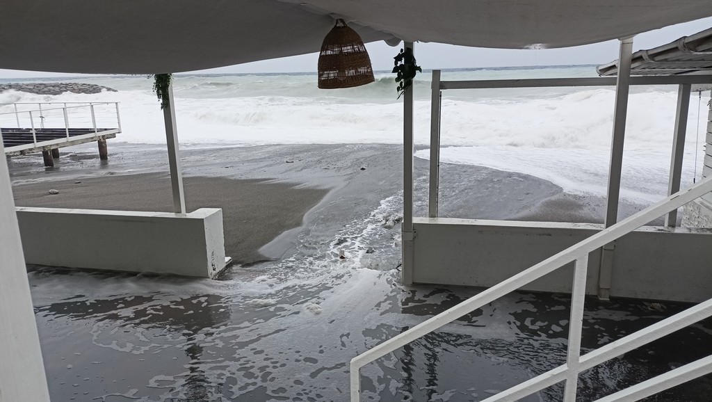 Mareggiata a Bordighera, le onde raggiungono la passeggiata e gli stabilimenti balneari (Foto e video)