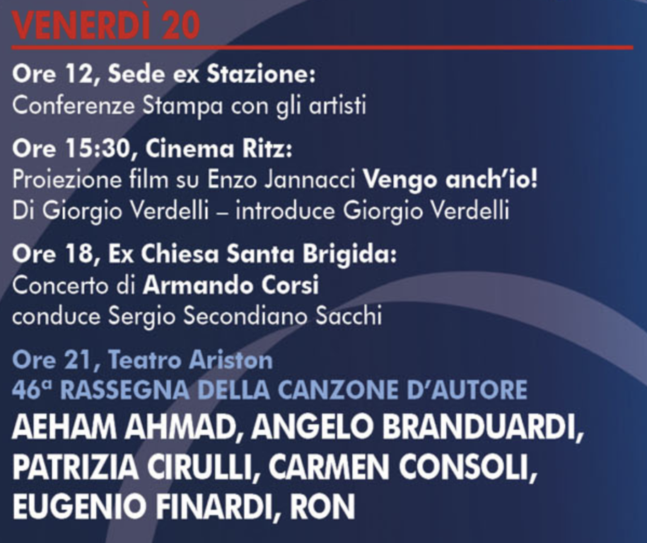 Alle 12 appuntamento nella sede del Club Tenco alla ex stazione ferroviaria per le conferenze stampa degli artisti, mentre alle 15.30 al cinema Ritz è in programma la proiezione del film di Giorgio Verdelli “Vengo anch’io!” su Enzo Jannacci. Alle 18 nella Pigna, all’ex chiesa di Santa Brigida, il concerto di Armando Corsi, conduce Sergio Secondiano Sacchi.