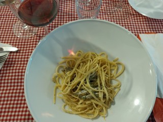 Sergio Orlando, titolare del ristorante, illustra il menù della serata: “Ogni piatto è stato abbinato con cura ai vini fantastici della Cascina Goregn. Abbiamo iniziato con una linguina con le acciughe accompagnata dall’Arneis, lo spezzatino di cinghiale con il Nebbiolo e infine la crostata di fichi e noci con il Moscato”.