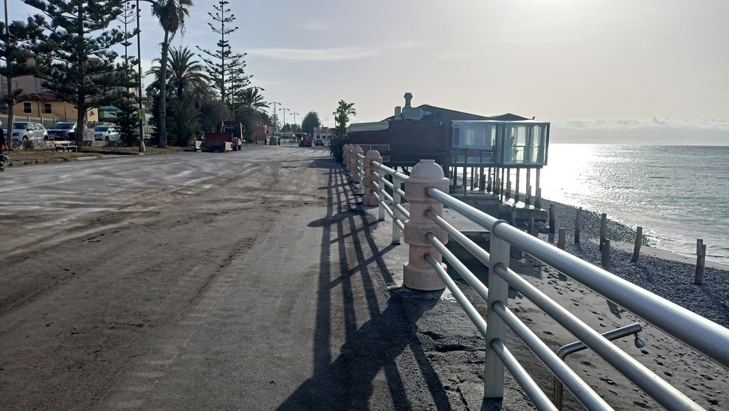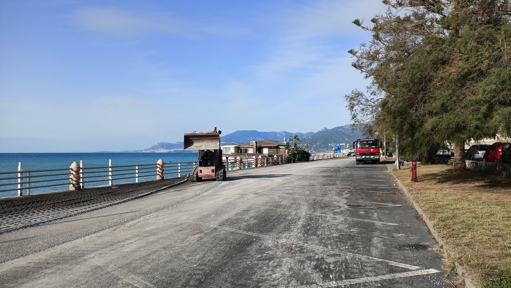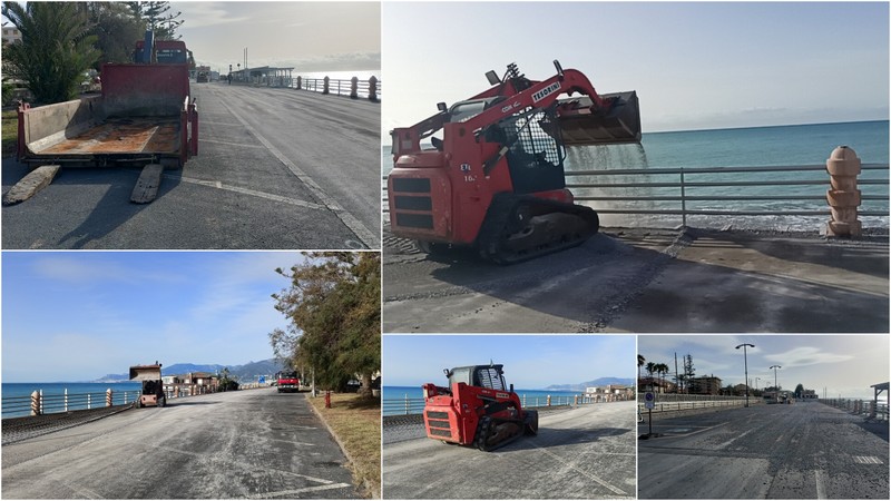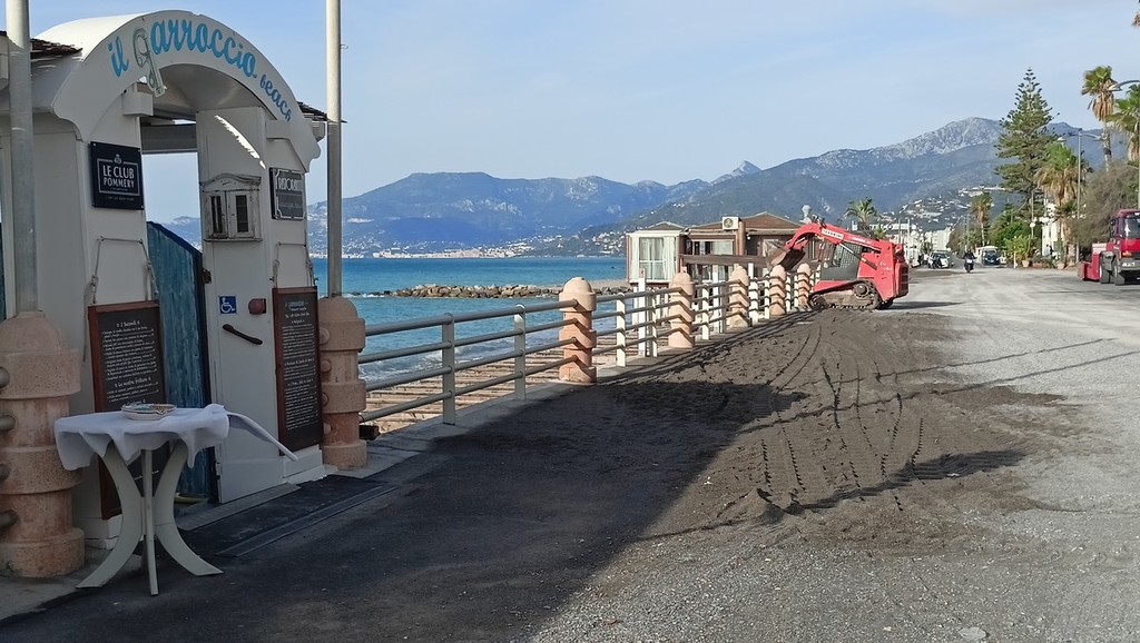 E' iniziata, questa mattina, la rimozione dal lungomare Argentina a Bordighera della ghiaia portata dalla mareggiata dei giorni scorsi.