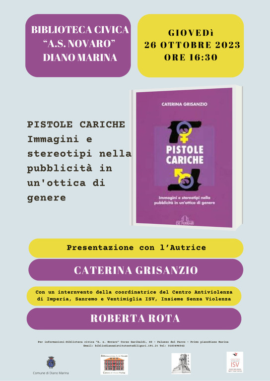 Giovedì prossimo alle ore 16.30, presso la Biblioteca civica A.S. Novaro di Diano Marina si terrà la presentazione del libro di Caterina Grisanzio Pistole cariche. Immagini e stereotipi nella pubblicità in un'ottica di genere. L’incontro è organizzato dalla Biblioteca Civica “A.S. Novaro” di Diano Marina in stretta collaborazione con l’Assessorato alla Cultura di Diano Marina. Interverrà la dott.ssa psicologa Roberta Rota, coordinatrice del Centro Antiviolenza ISV di Imperia, Sanremo e Ventimiglia, Insieme senza violenza.