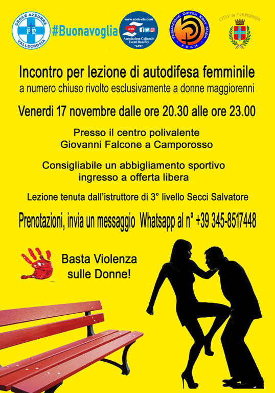 Venerdì 17 novembre alle 20.30 si terrà, invece, un corso di autodifesa. L'evento, patrocinato dalla città di Camporosso, è organizzato dal gruppo Buonavoglia, composto da Aceb Camporosso e dalla Croce Azzurra Misericordia di Vallecrosia, presso la sala polivalente Giovanni Falcone a Camporosso. "Un incontro per lezione di autodifesa femminile, rivolto esclusivamente a donne maggiorenni. E' consigliabile un abbigliamento sportivo. L'ingresso è a offerta libera" - fanno sapere gli organizzatori - "Lezione sarà tenuta dall'istruttore di 3° livello Secci Salvatore. Si può prenotare la propria partecipazione scrivendo su WhatsApp al n° +39 345 85 17448: Partecipo al corso di autodifesa femminile, il proprio nome e cognome".
