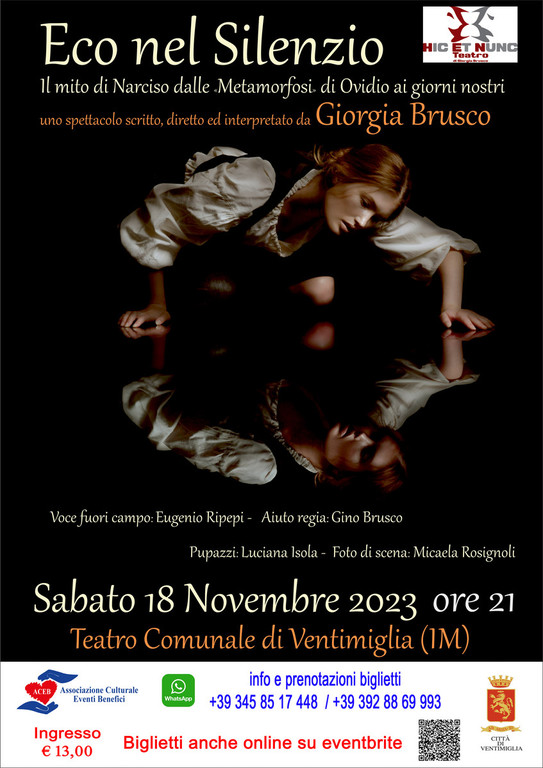 Sabato 18 novembre alle 21, presso il teatro comunale di Ventimiglia, andrà in scena uno spettacolo teatrale dal titolo Eco nel Silenzio, diretto e interpretato da Giorgia Brusco. Per info e prenotazioni biglietti contattare su WhatsApp il +39 345 85 17 448 oppure il +39 392 88 69 993. L'ingresso è di 13 euro. I biglietti sono disponibili anche online su Eventbrite cliccando qui. L'evento è patrocinato dalla città di Ventimiglia.